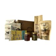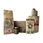 Contenido- Un café 250 gramos molido Un chocolate 100% en polvo Una miel mini especial de bosque de Swaka Una miel mini de recuperación social Una barra de chocolate 85% Una barra de chocolate 72 % Una panela orgánica de 150 gramos en polvo
